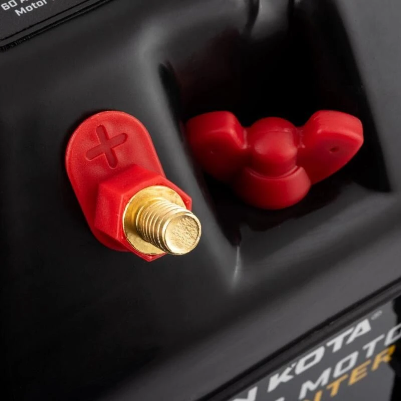- Zoals bij de meeste gewone scheepsaccu’s is de Rode Vleugelmoer voor de Rode Positieve (+) pool . De zwarte vleugelmoer voor de zwarte negatieve (-) pool is .